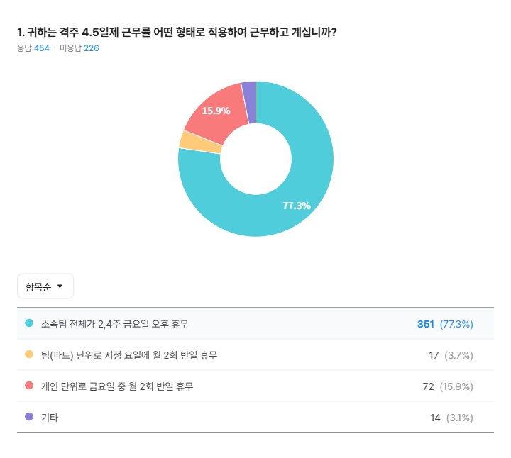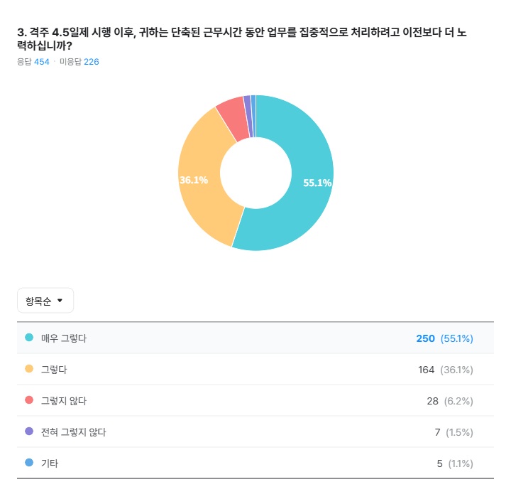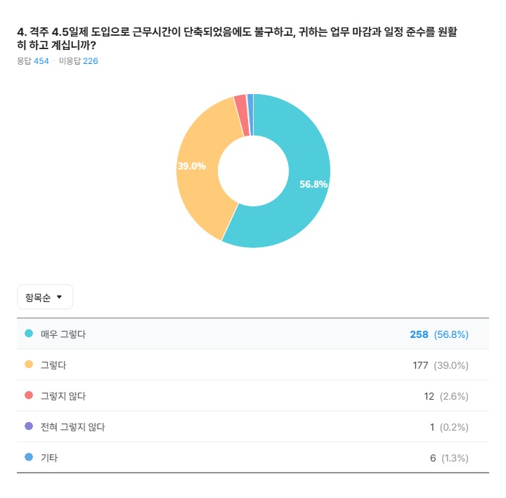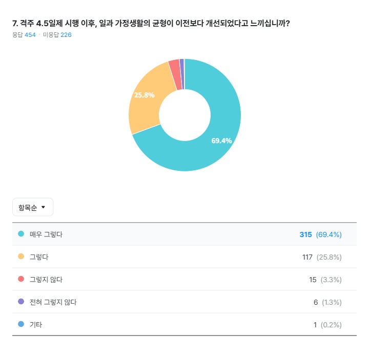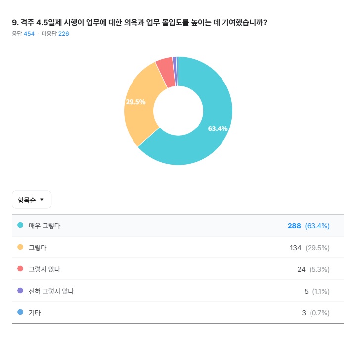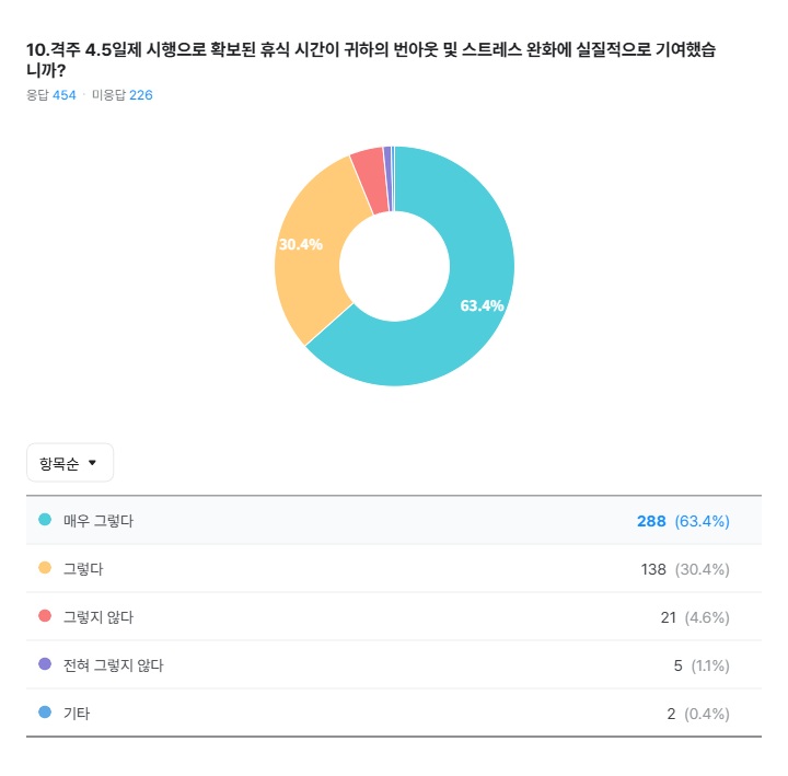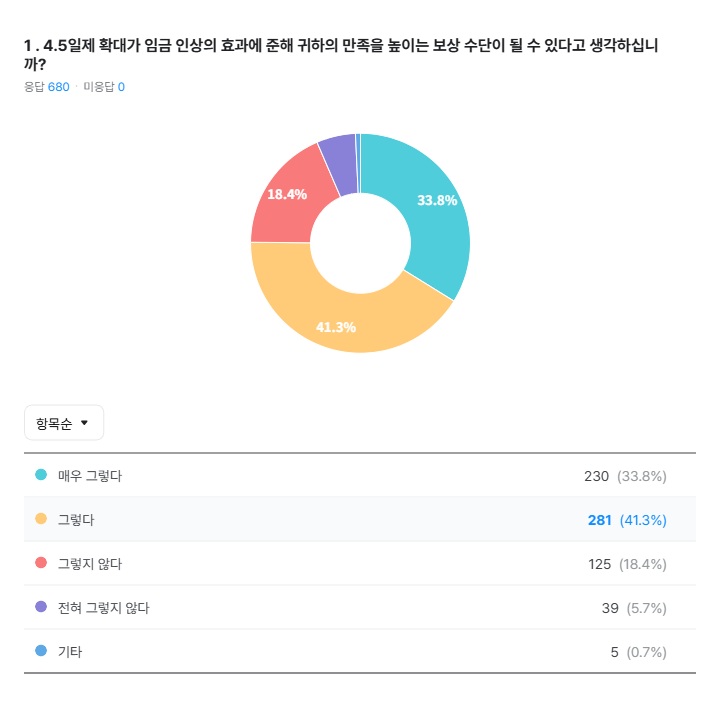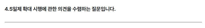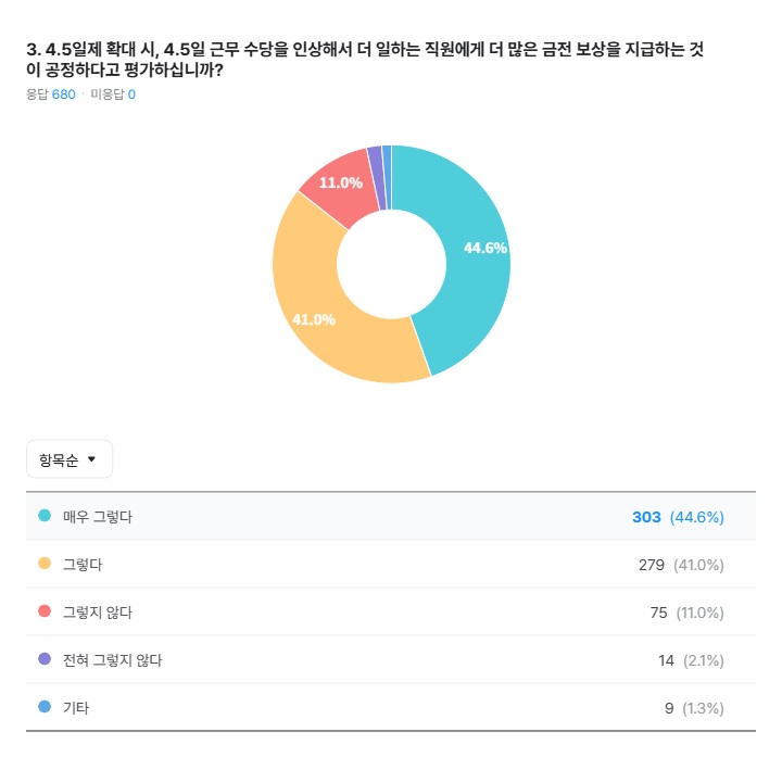 홈 조합활동 [서울지부] 4.5일제 확대 시행 관련 설문조사 전체 결과 전국언론노동조합 MBC본부 입력 2025-11-06 조회수 66 가 가 설문조사 대상자 : 전국언론노조 MBC본부 서울지부 조합원 1,174명 설문조사 응답자 : 680명 (응답률 58%) 설문조사 기간 : 2025년 10월 17일~10월 24일 설문 방법 : 익명 / 인터넷 설문 응답 (네이버웍스 링크) 설문조사 기관 : 전국언론노조 MBC본부 서울지부 조회수 66 저작권자 © 전국언론노조 MBC본부 무단전재 및 재배포 금지
