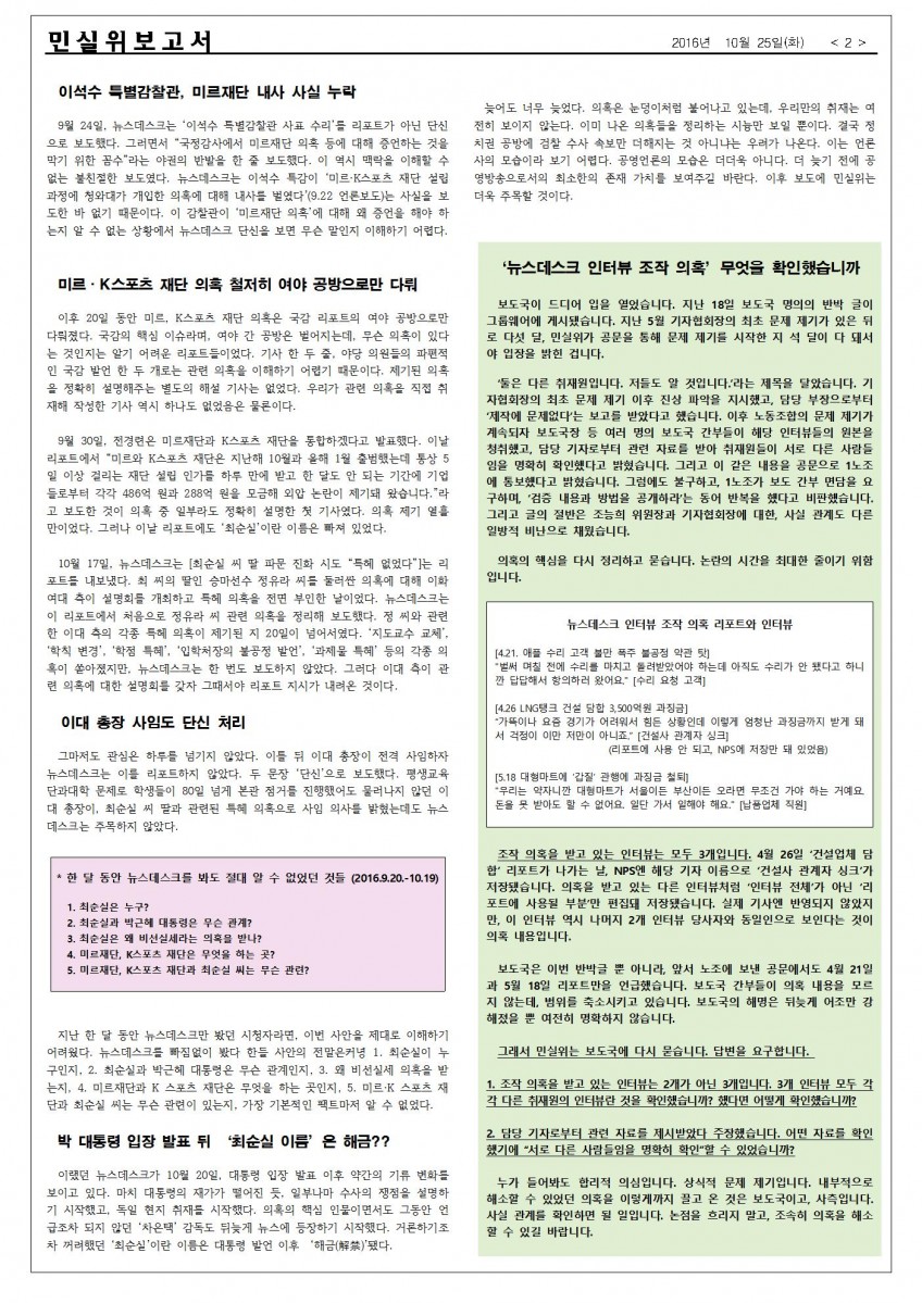 홈 민주방송실천위원회 [민실위보고서] 대통령 입만 쳐다보는 뉴스데스크 전국언론노동조합 MBC본부 입력 2016-10-25 조회수 5,022 가 가 민실위보고서] 10/25일자 대통령 입만 쳐다보는 뉴스데스크 – 최순실 의혹 한 달 동안 정치 공방으로 처리, 대통령 발언 나오자 뒤늦게 쟁점 설명 – 최순실이 누구인지는 단 한 차례도 설명 없어 ‘뉴스데스크 인터뷰 조작 의혹’무엇을 확인했습니까 *첨부파일을 확인하세요 조회수 5,022 첨부파일 2016.10.25-민실위보고서.hwp - 775 KB 저작권자 © 전국언론노조 MBC본부 무단전재 및 재배포 금지
