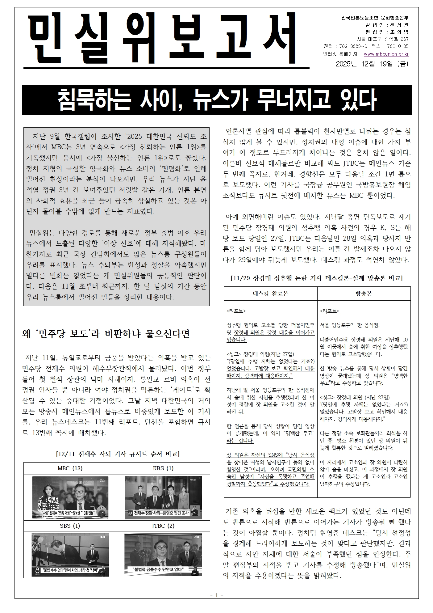 홈 민주방송실천위원회 [민실위보고서] 침묵하는 사이, 뉴스가 무너지고 있다 전국언론노동조합 MBC본부 입력 2025-12-19 조회수 169 가 가 조회수 169 첨부파일 20251219_민실위보고서.hwp - 4127 KB 20251219_민실위보고서.pdf - 332 KB 저작권자 © 전국언론노조 MBC본부 무단전재 및 재배포 금지