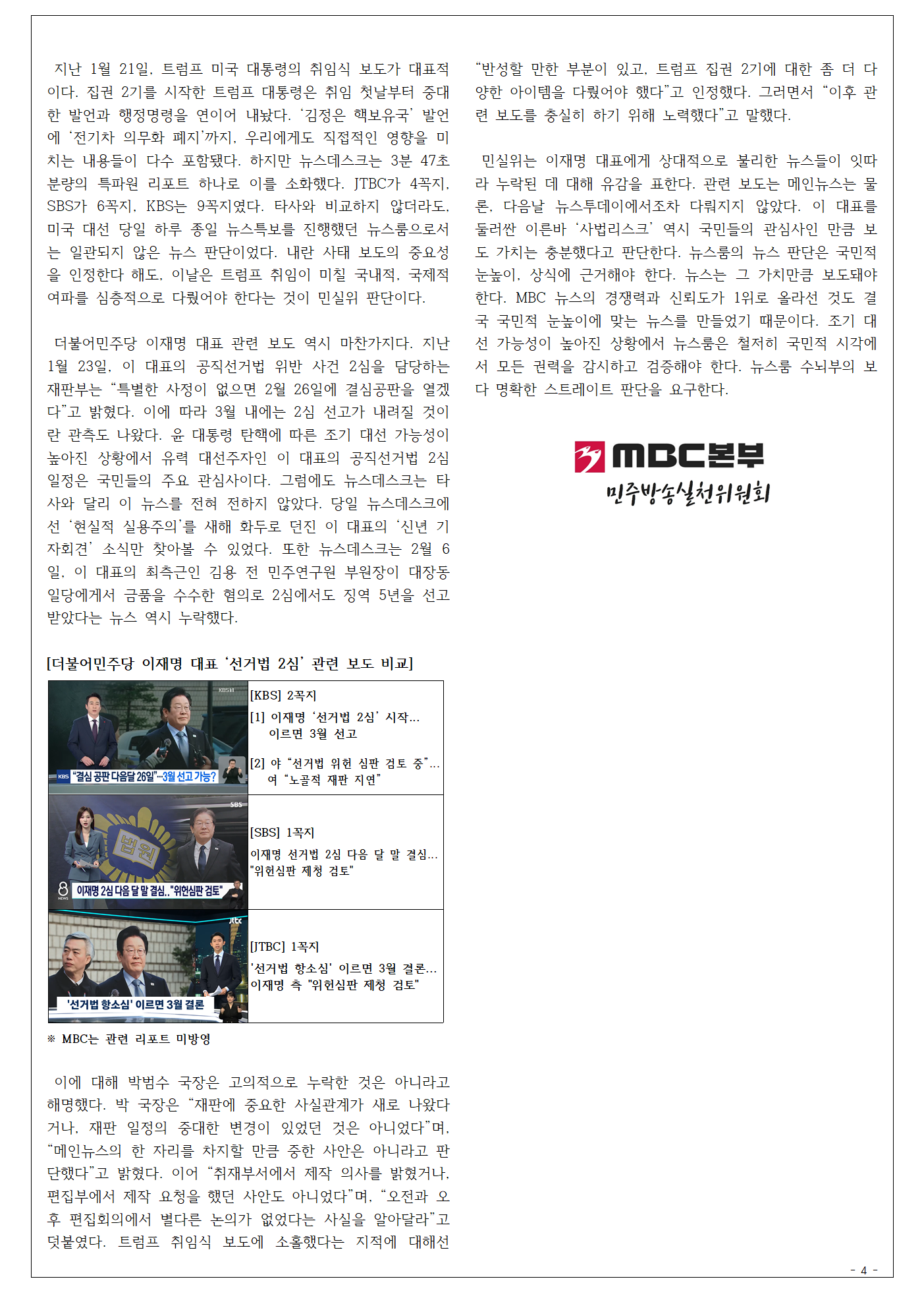 홈 민주방송실천위원회 [민실위보고서] ‘12.3 내란 사태’ 이후, MBC 뉴스를 돌아본다 전국언론노동조합 MBC본부 입력 2025-02-19 조회수 857 가 가 조회수 857 첨부파일 2025-0217-민실위-보고서.pdf - 999 KB 저작권자 © 전국언론노조 MBC본부 무단전재 및 재배포 금지